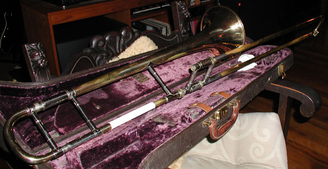 This is the newer of the two instruments. The serial number places it as 19453 production. This horn has a "VII" designation. I can't find anything on the Web about this model designation. This horn plays great and belies it's age. It has a 7 inch bell and a 0.495 inch bore. It is very bright and very loud and is a great lead horn. The slide is lightweight and the small size of the horn makes the whole horn very lightweight. There are some refinements from the 1933 model: a slide lock and a thinner rolled edge on the bell. The playing characteristics are: loud, bright, sure and slots peddle tones better than a bass trombone. No wonder Pryor like this size horn. This is not a small sounding instrument.